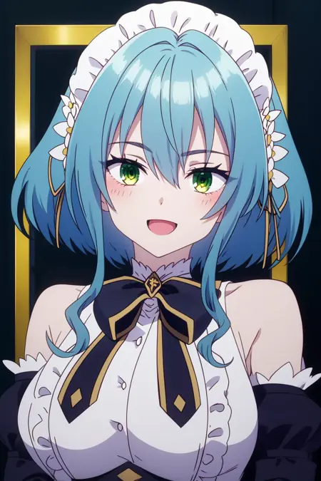Appearance: villhaze, green eyes, hair between eyes, blue hair, short hair, sidelocks, large breasts