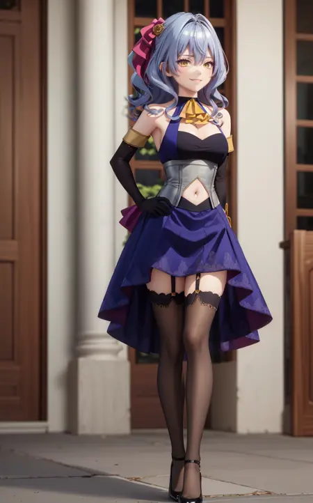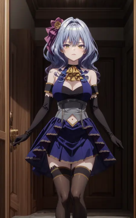 服装:过膝袜、蓝色连衣裙、蓝色裙子、黑色手套、服装镂空、长裙、露肩、领结、肚脐、分离袖子