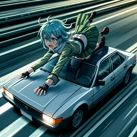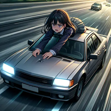 I have created a Lora that lets your favorite character cling desperately atop a speeding car, a scene reminiscent of dramatic chases in movies. Upon testing, there are some discrepancies in the size of the character relative to the car, giving a somewhat off-scale appearance. However, with some luck, you can generate a scene where your character is gripping onto the top of the car. It's worth trying a few times to get it right.