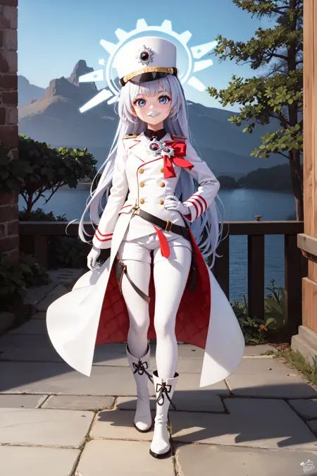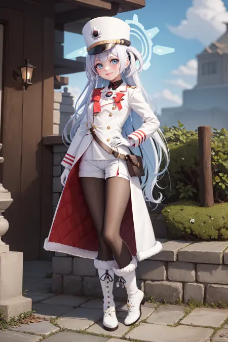 Outfit : shako cap, white jacket, white coat, uniform, white gloves, white shorts, black pantyhose, fur-trimmed shoes, fur-trimmed boots,