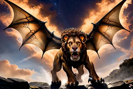 マンティコアまたはマンチアールは、エジプトのスフィンクスに似たペルシャの伝説上の生物で、西欧中世芸術にも広く広がった。人間(のような)の頭部、ライオンの体、サソリの尾、またはハリネズミの棘に似た毒針状の尾を持つ。#artisticlicense