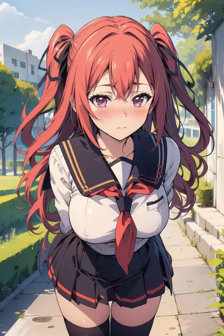appearance: mio naruse, long hair, red hair, two side up, purple eyes, large breasts,