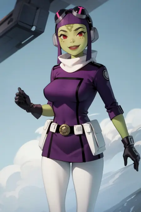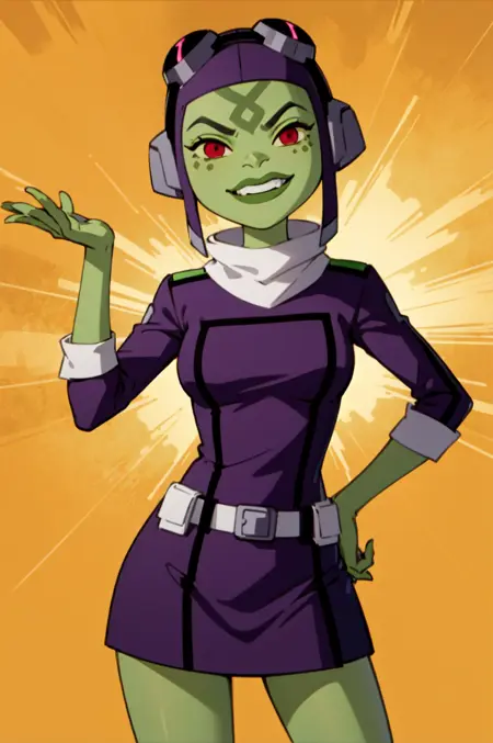 Even when prompting for "green skin" some generations will result in her having human skin, specially when prompting for clothing that shows off skin. Incrase weight or try negative prompts to mitigate the effect. The best counter in my testing is "(green skin, colored skin:1.2)"
