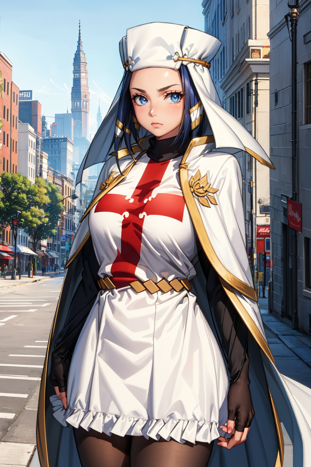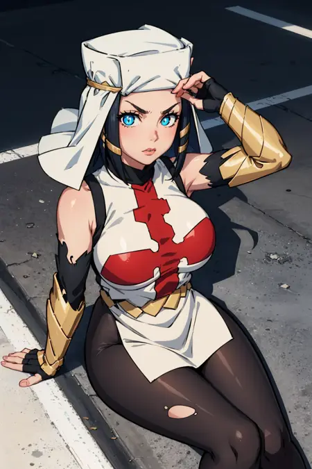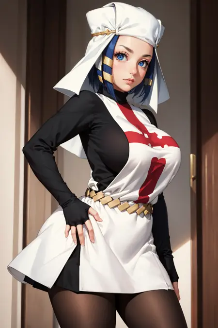 彼女の典型的な外見には、「白い頭飾り、赤と白のドレス、黒い袖、黒いパンスト、指なし手袋、腕プロテクター」を追加してください。