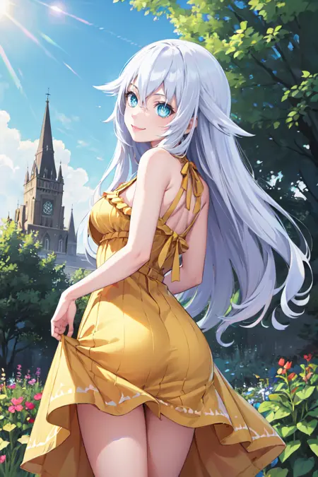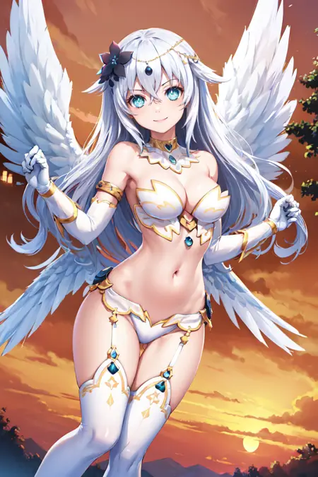 "BlackHeartAngel, symbol-shaped pupils, hair flower, hair ornament, angel, wings, revealing clothes, white gloves, white thighhighs"