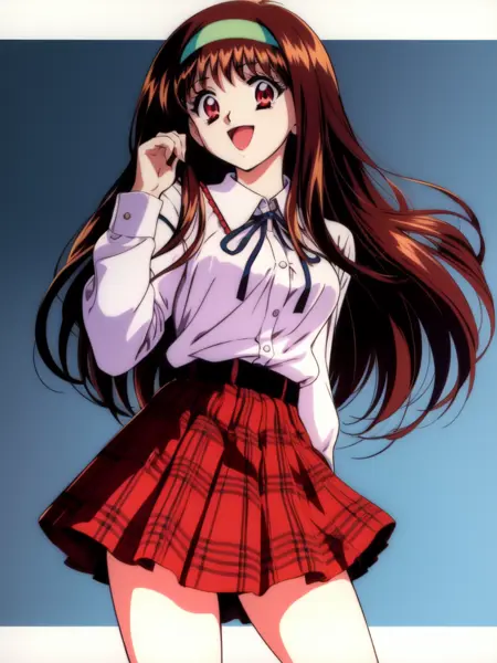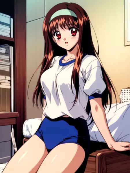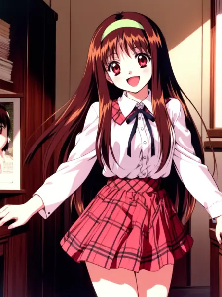 Yuuki_Mizuho(kakyuusei), 1girl, solo, brown hair, long hair, white hairband, red eyes, breasts, brown eyes,