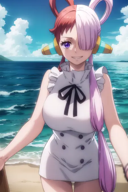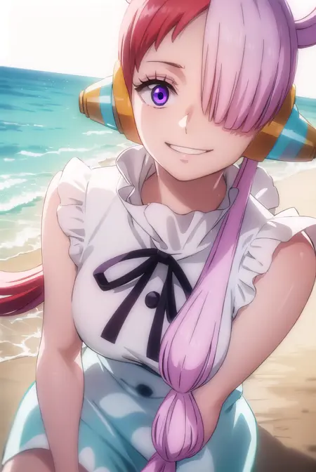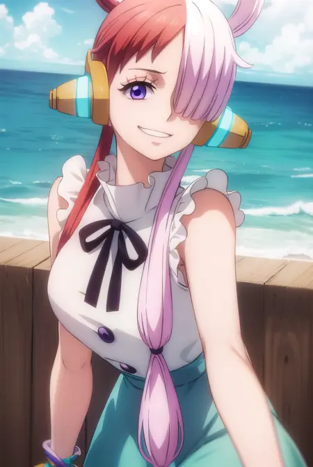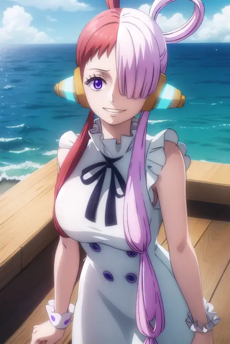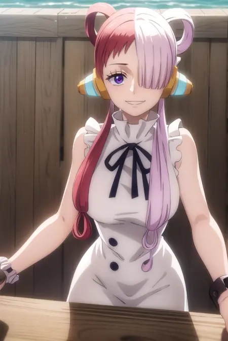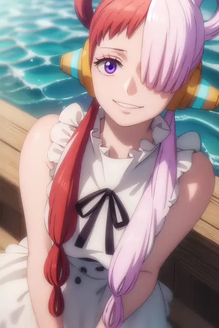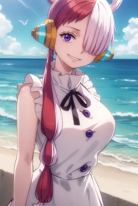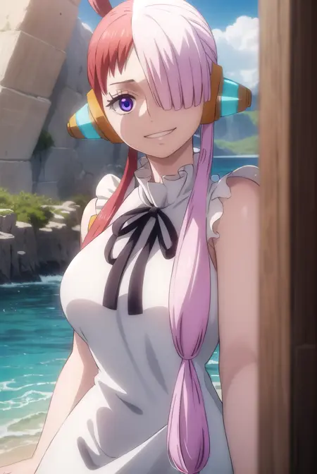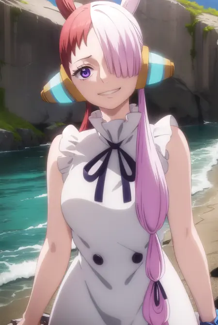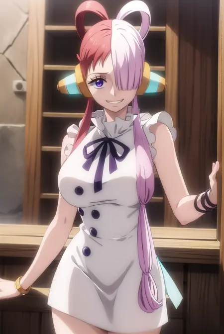 uta, long hair, (purple eyes:1.1), white hair, red hair, multicolored hair, (hair over one eye:1.5), two-tone hair, split-color hair, hair rings, sidelocks,