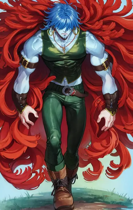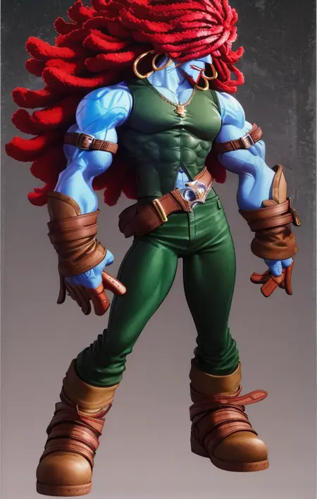 所有示例均使用以下提示:'highres, detailed, (sketch:0.7), (watercolor:0.7), forest, wide view full body, male focus, solo, amarant coral [final fantasy], blue skin, short red hair, hair over eyes, green pants, green shirt, boots, hoop earrings, muscular'