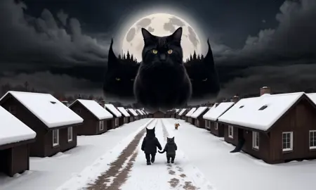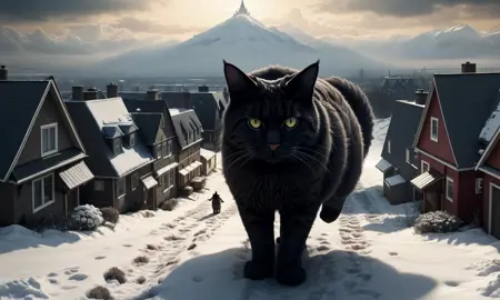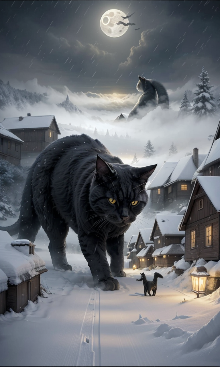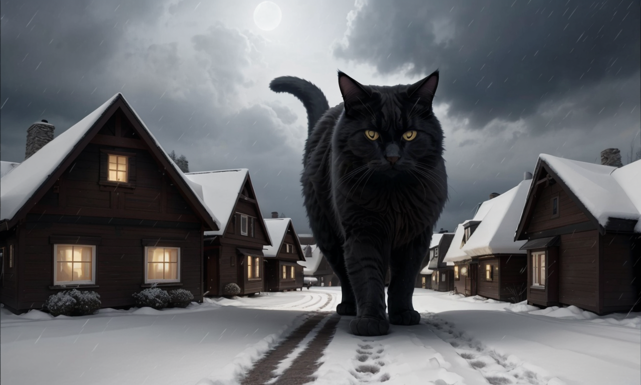 Best prompts to use are Giant or Gigantic cat, snowy, glowing eyes.
