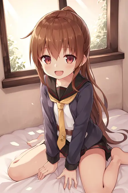 1girl, brown eyes, ponytail, very long hair, flat chest,
