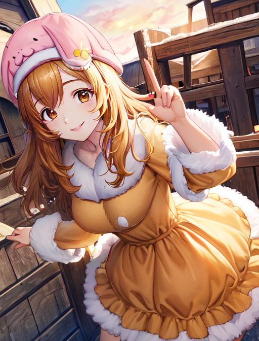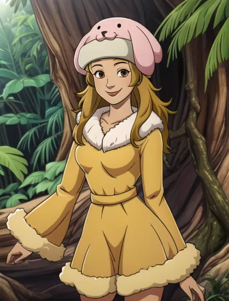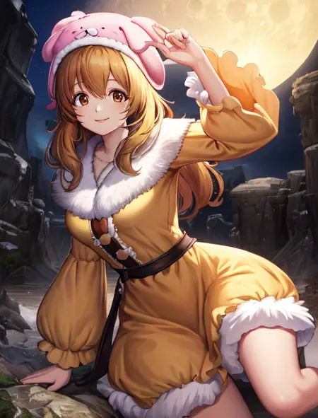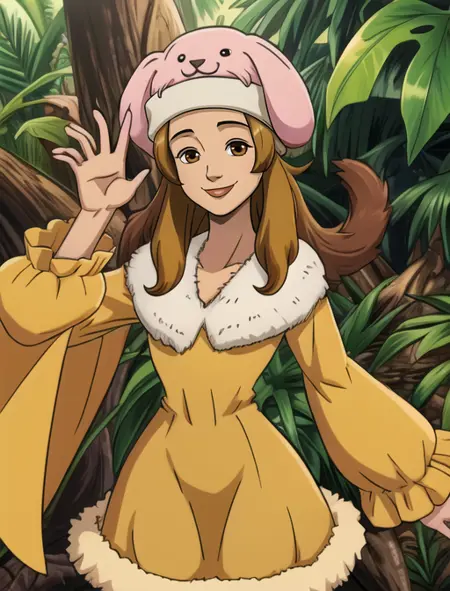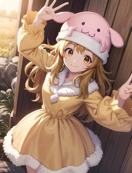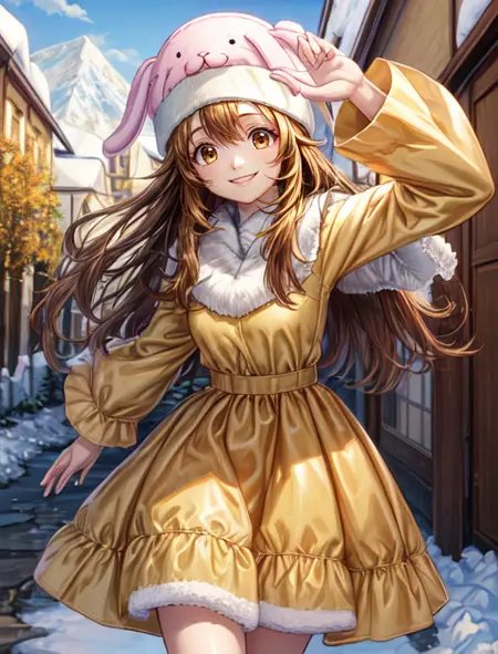 Additional words that may help: animal hat, brown eyes, yellow dress, fur trim,