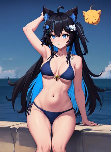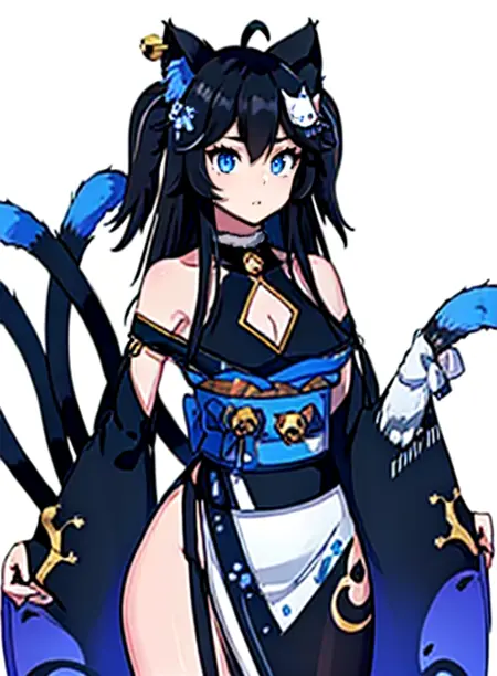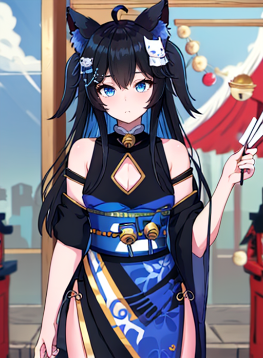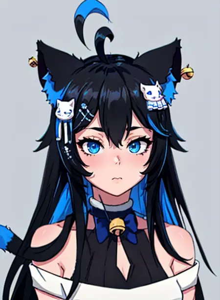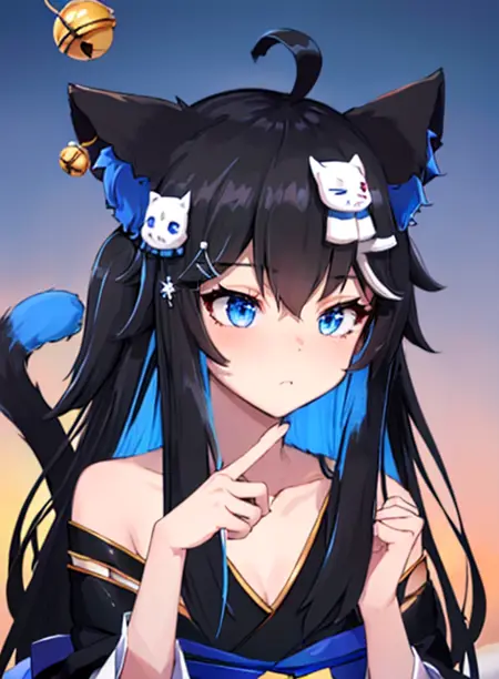 nott vt, animal ears, cat ears, black hair, long hair, cat girl, blue eyes, multicolored hair, blue hair, ahoge, hair ornament, jingle bell
