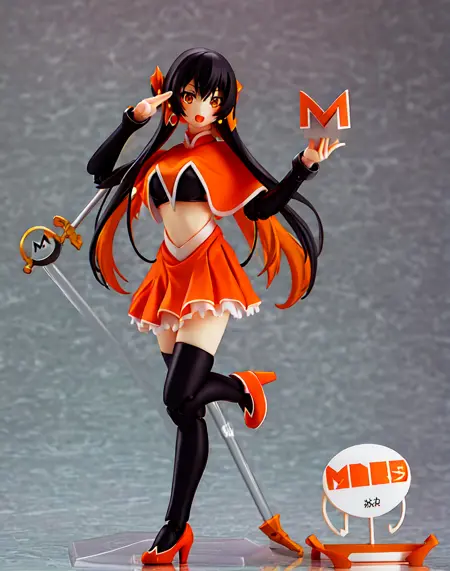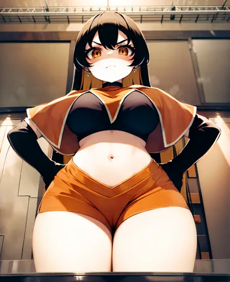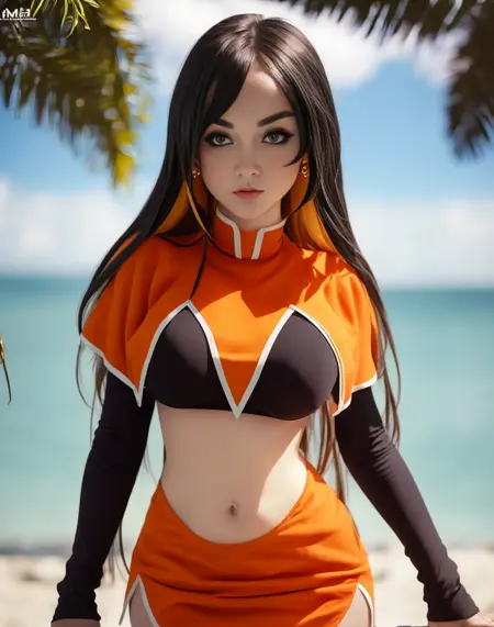 For the default costume these prompts can help: monerochan, 1girl, colored inner hair, long orange hair, orange skirt, orange capelet, dark crop top, sleeves, navel, midriff, thighhighs, orange eyes, letter m, round stud earrings, cosplay(stud earrings because it makes them smaller)