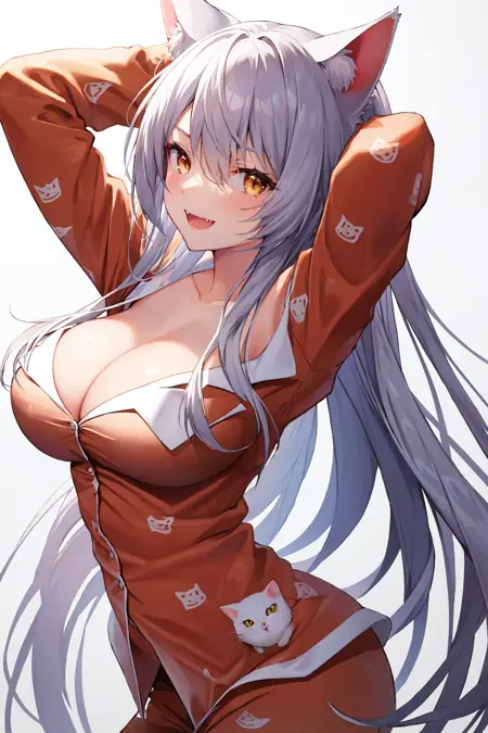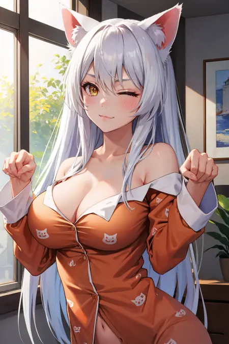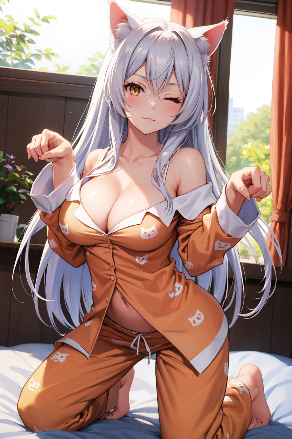 Add "very long hair, orange pajamas, off-shoulder, cleavage, cat print" for her pajamas.