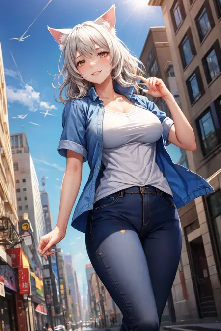 添加 "short hair, blue jacket, white shirt, jeans" 以获得她的短发造型。