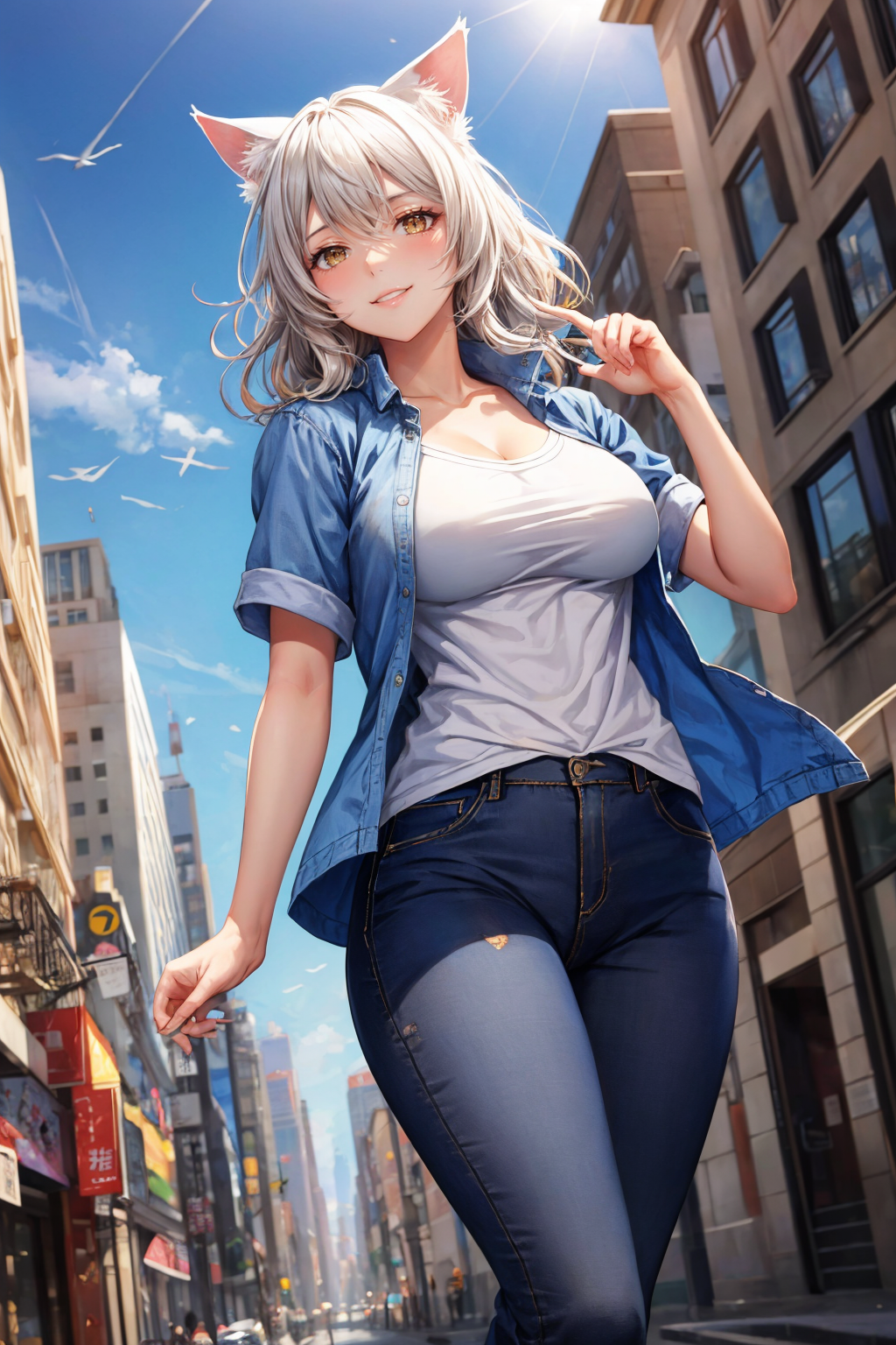 Add "short hair, blue jacket, white shirt, jeans" for her short haired look.