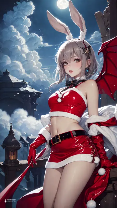 4. The trigger words are: tutututu, bare shoulders, belt, crop top, red pencil skirt, miniskirt,christmas_dress,fur trim, red fingerless gloves, midriff, santa costume, rabbit tail, rabbit ears, fake animal ears,,