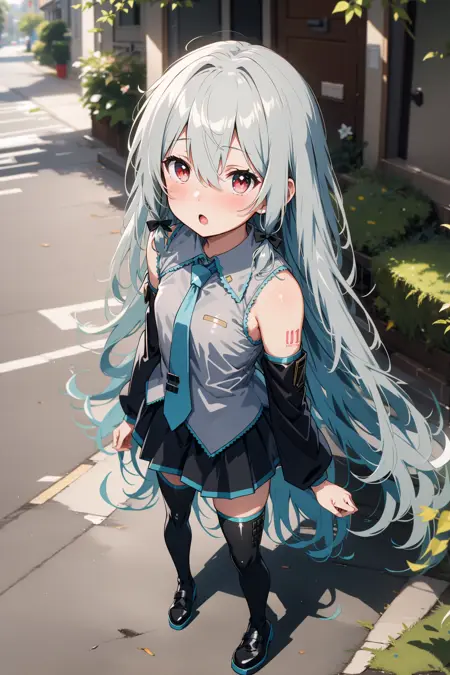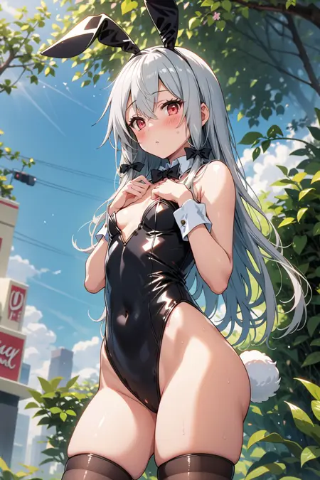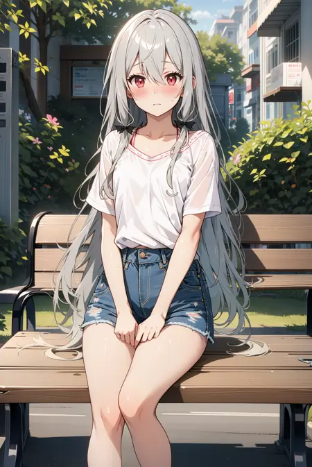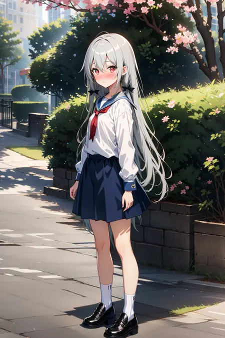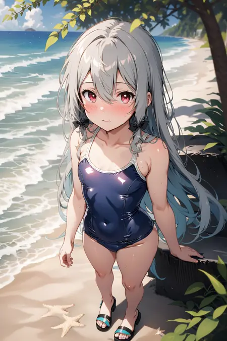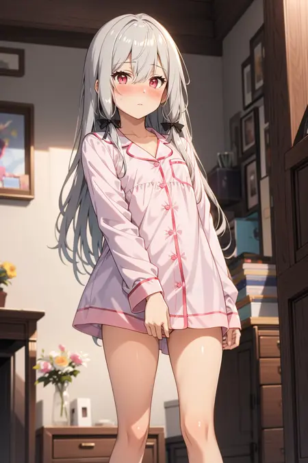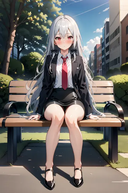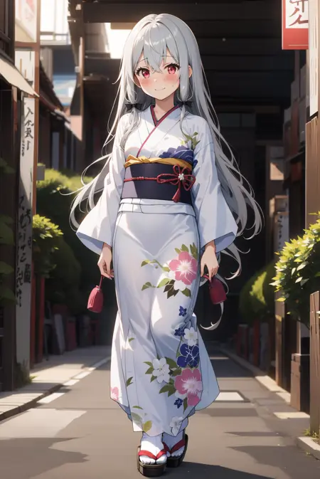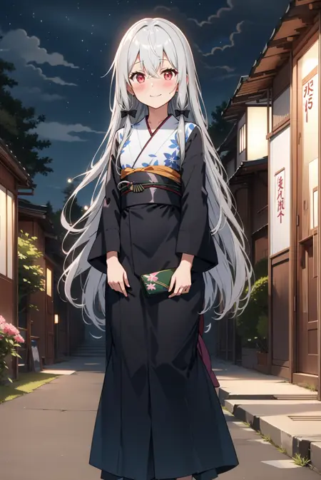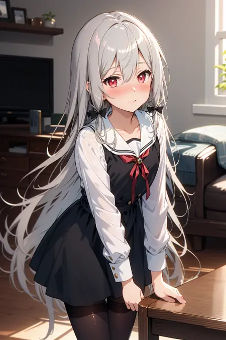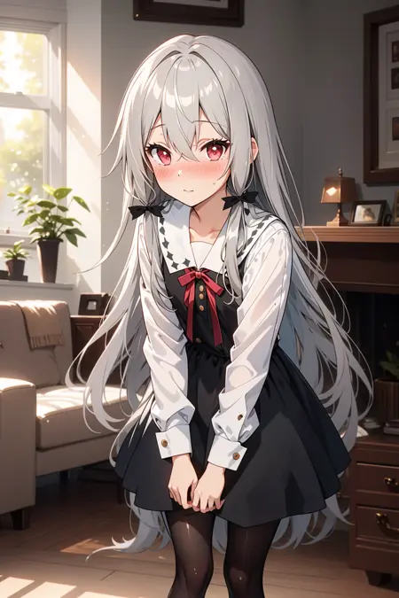appearance: sophie twilight, red eyes, grey hair, very long hair, hair between eyes, sidelocks, small breasts, flat chest,
