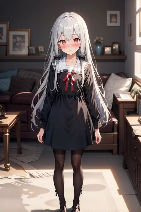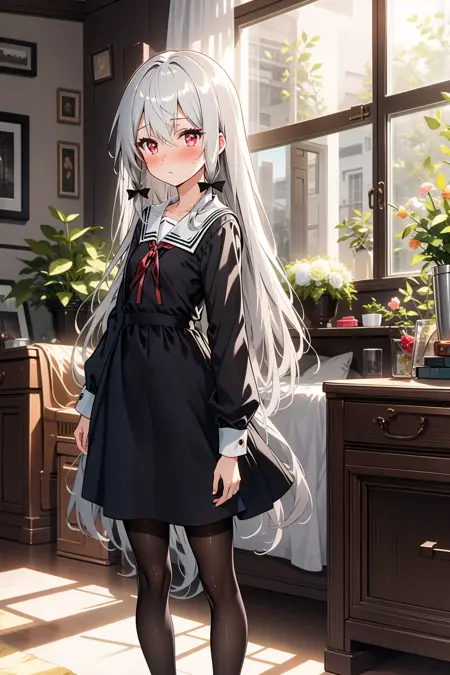 outfit: black dress, black pantyhose, tress ribbon, white sailor collar, brooch, red ribbon, black tress ribbon,