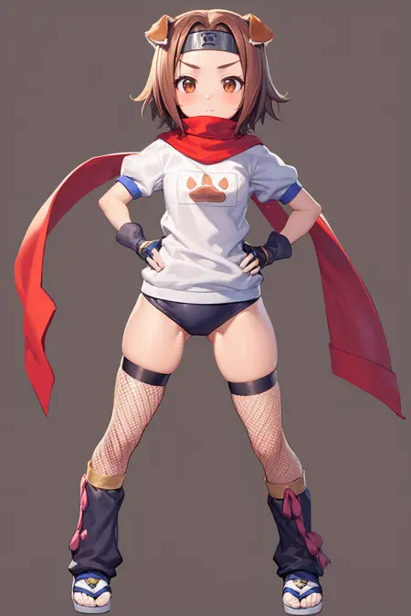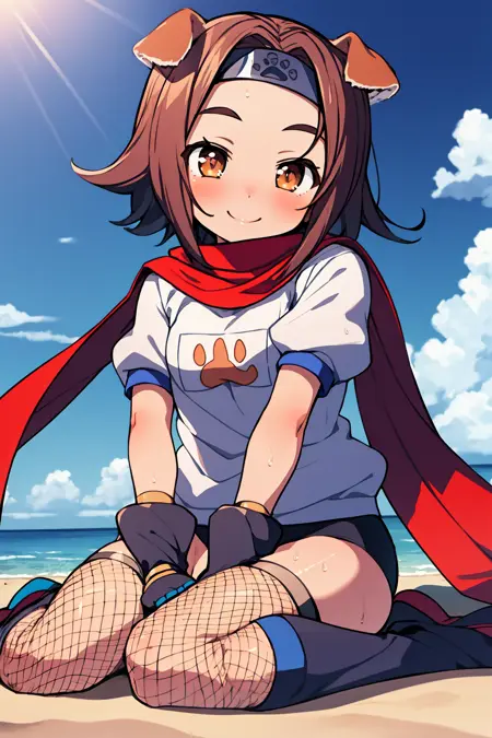 Outfit prompts : red scarf, buruma, fishnet thighhighs, gloves, gym uniform, dog tail