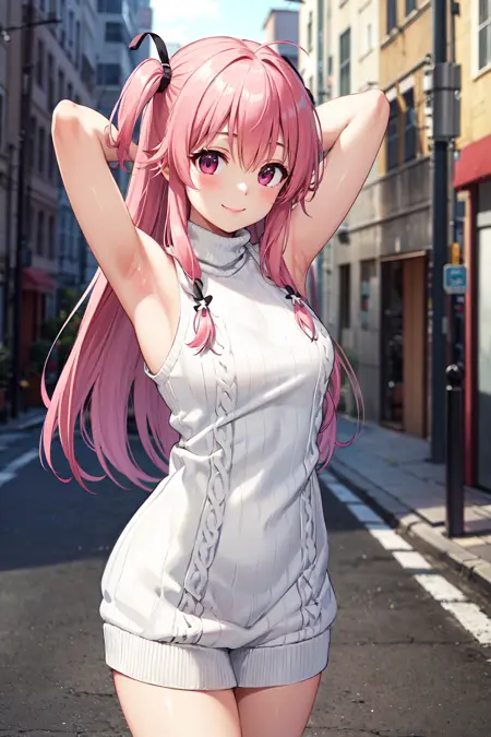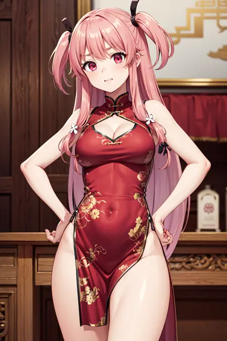 • aayui,long hair,two side up,hair ribbon,hair ornament,choker,shinda sekai sensen uniform,serafuku,blue sailor collar,neckerchief,white shirt,long sleeves,chain,demon tail,skirt,blue skirt,thigh strap,ankle lace-up,cross-laced footwear