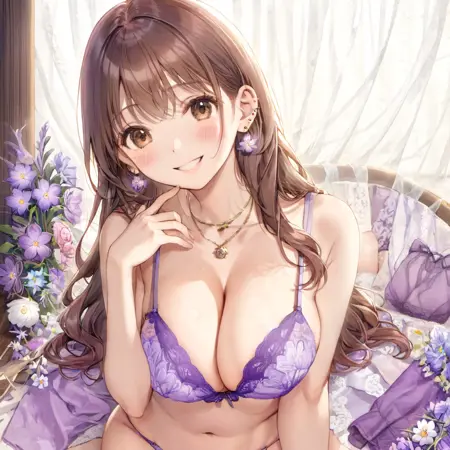 UW03, 1girl, underwear, solo, bra, panties, underwear only, purple panties, purple bra, cleavage, lingerie,
