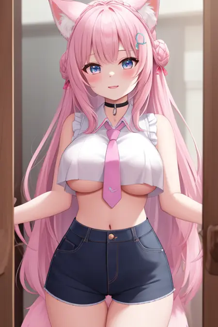 sleeveless, underboob, crop top overhang, heart necktie, black choker, midriff, collared shirt, sleeveless shirt