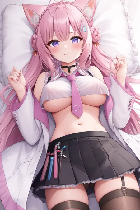 underboob, crop top overhang, heart necktie, black choker, midriff, collared shirt, sleeveless shirt, white jacket, open jacket, frills, black skirt, black legwear