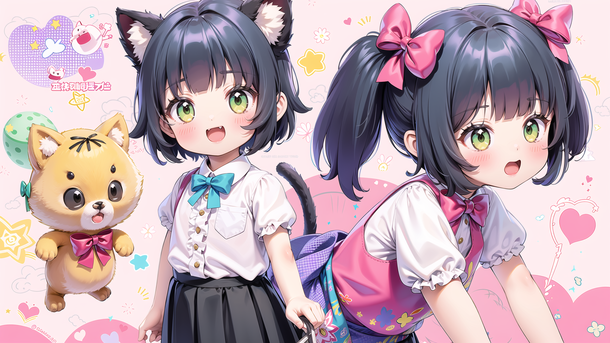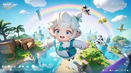 ,(masterpiece, top quality, best quality, official art, beautiful and aesthetic:1.2),(8k, best quality, masterpiece:1.2),a cartoon character is playing with a cat and other animals in a cartoon scene with a rainbow background and a chinese text, smile, open_mouth, brown_hair, shirt, animal_ears, brown_eyes, tail, closed_eyes, multiple_boys, sky, shoes, shorts, cloud, arms_up, >_<, red_shirt, orange_shirt, rainbow, orange_footwear <lora:Game Icon Institutemmo2:0.8>