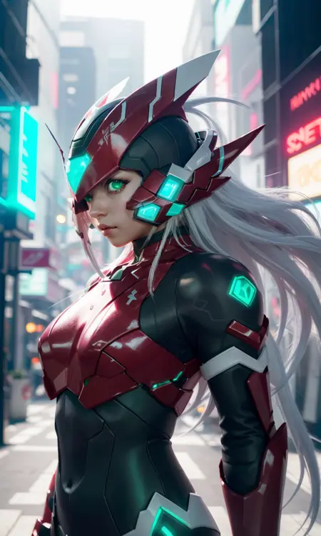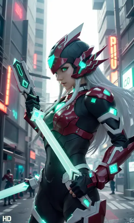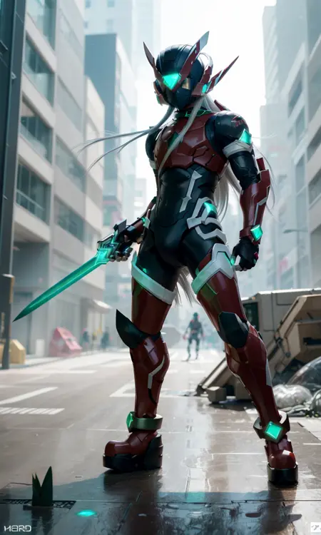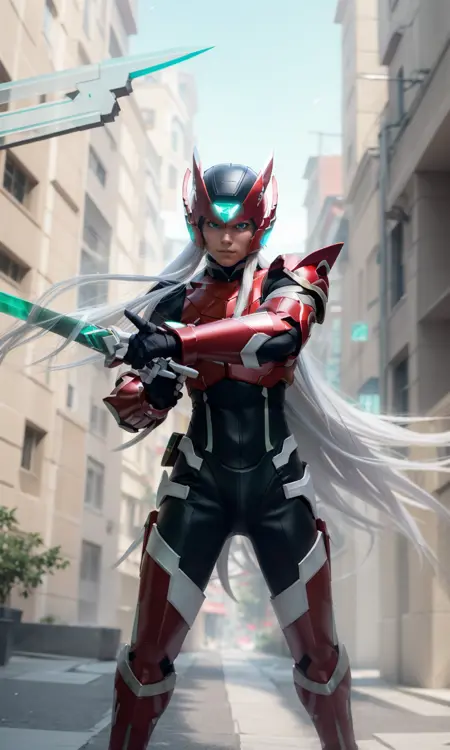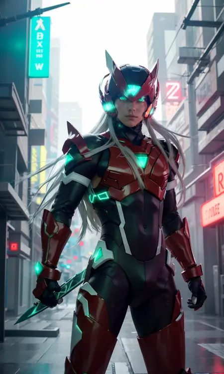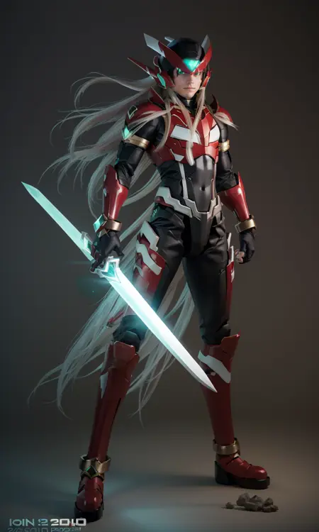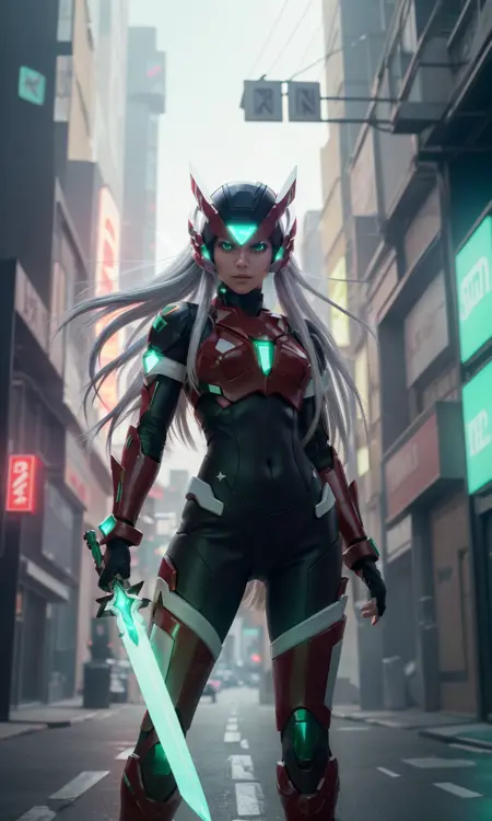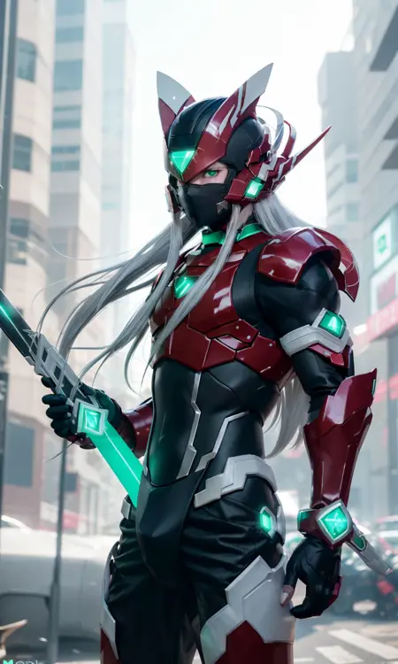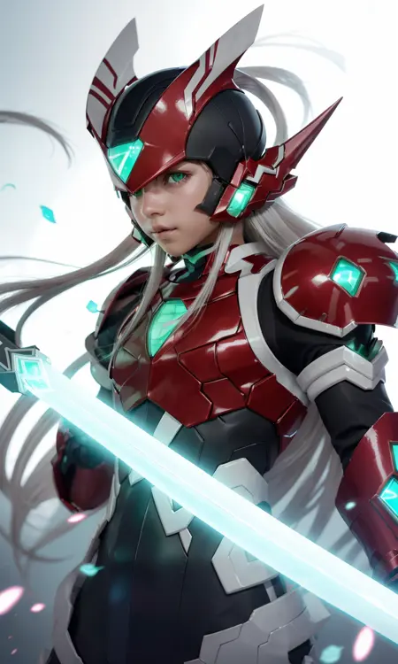 Recommended prompts long white hair, red armor, green energy sword, glowing green eyes.