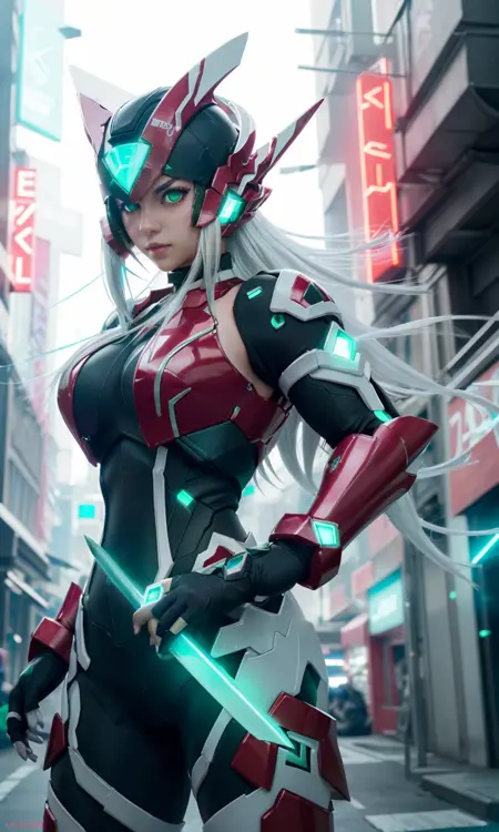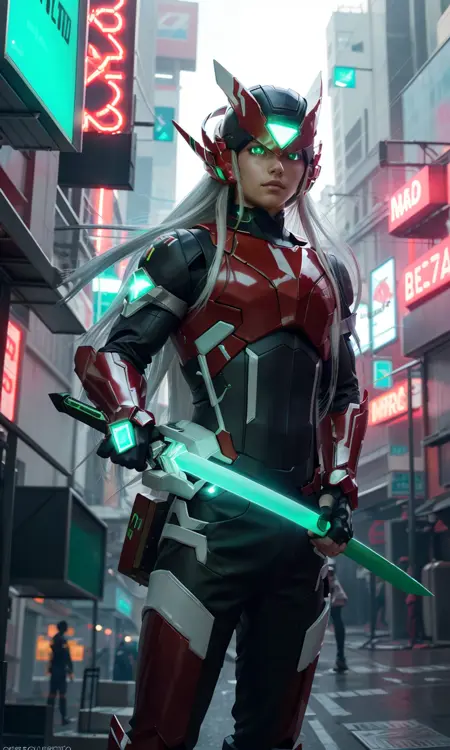 推荐提示词:长白发、红色装甲、绿色能量剑、发光的绿色眼睛。