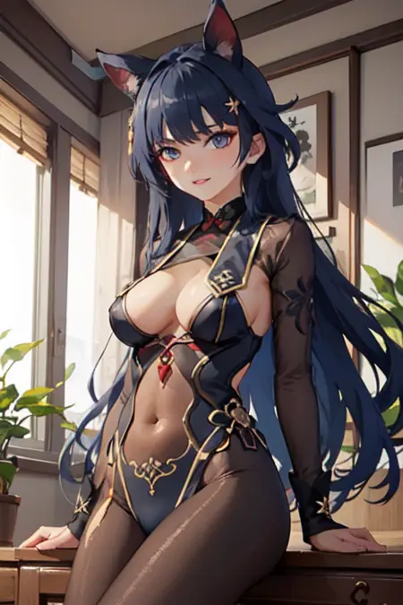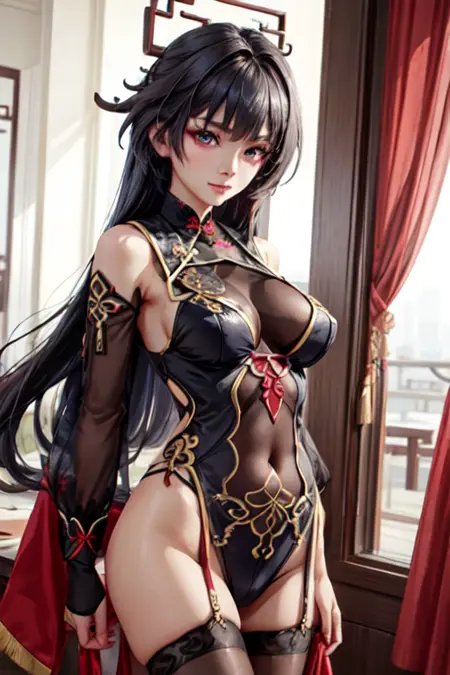 Aqueous Springtide:aqueous springtide, herrscher of thunder, raiden mei, horns, bodystocking, china clothes, glasses. Remove glasses for Rainy Springtide Costume.