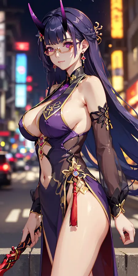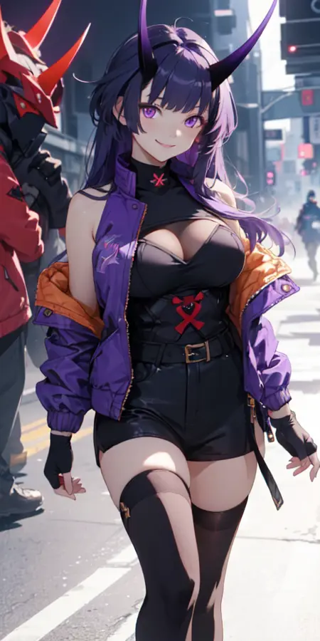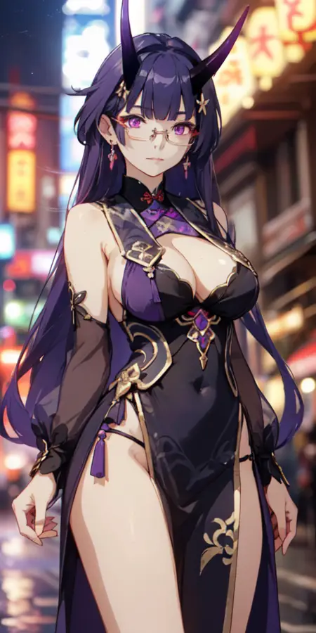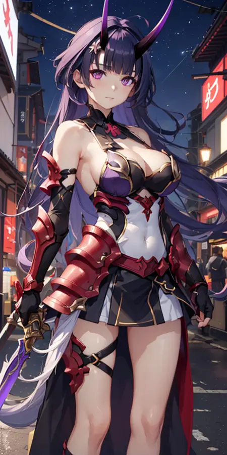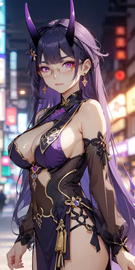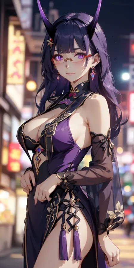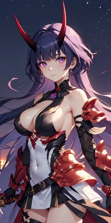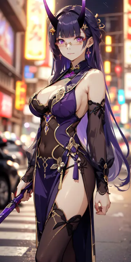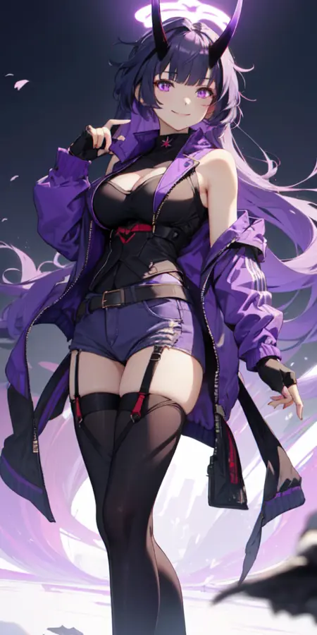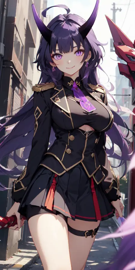 Haunted Dusk:haunted dusk, herrscher of thunder, raiden mei, purple eyes, purple hairs, long hairs horns