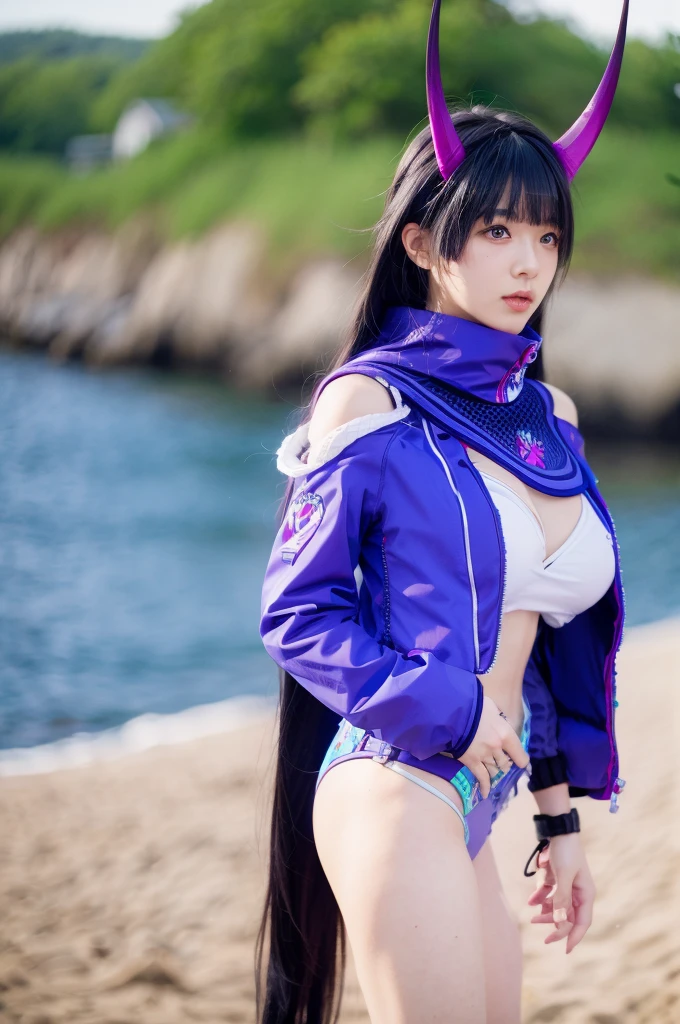 Haunted Dusk:haunted dusk, herrscher of thunder, raiden mei, purple eyes, purple hairs, long hairs horns