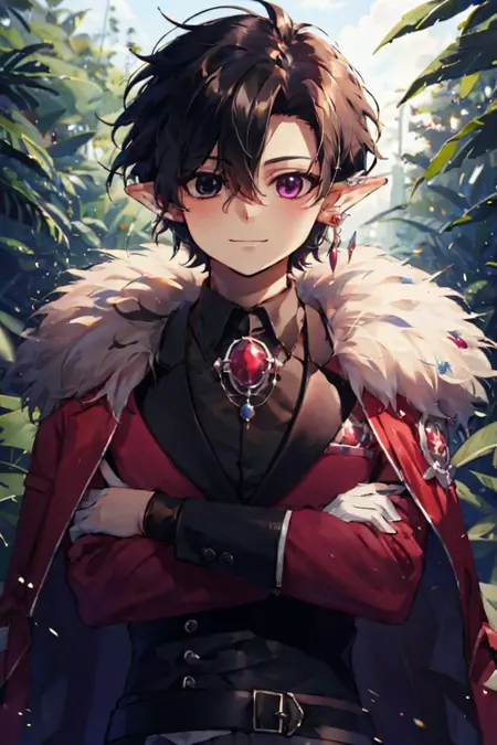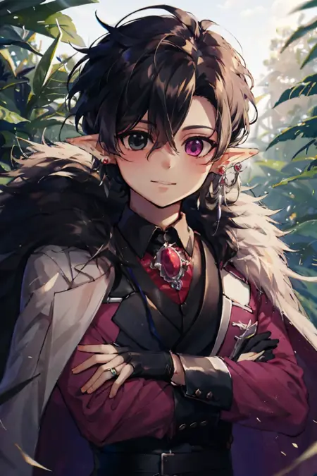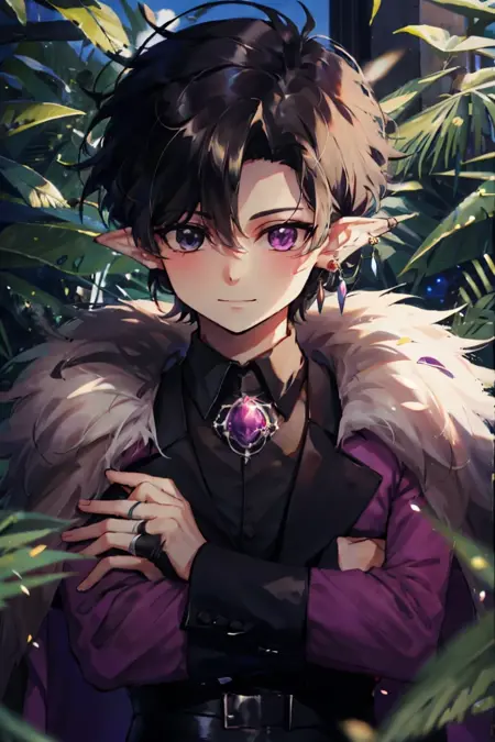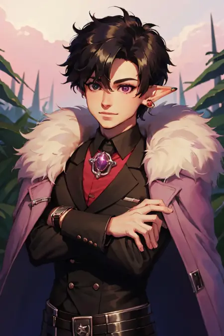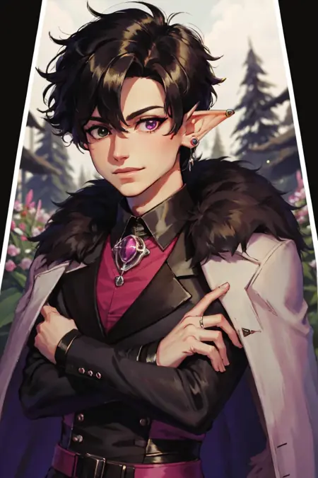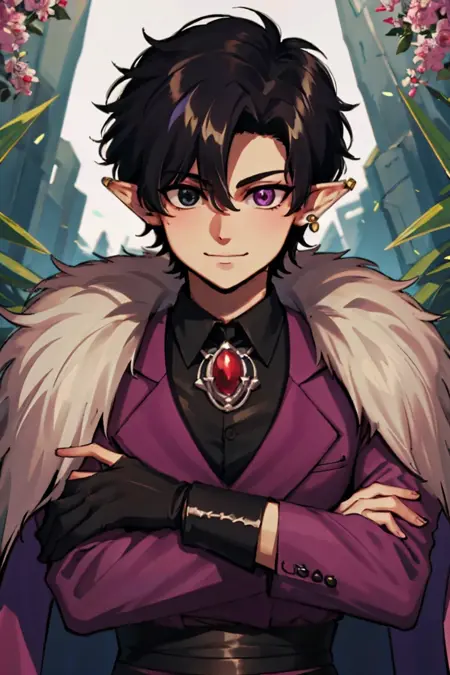 elementalbomber, 1boy, male focus, pointy ears, black hair, jewelry, black gloves, black eyes, heterochromia, hair between eyes, earrings, gem, bangs, purple eyes, jacket, fur trim, pink eyes, ring