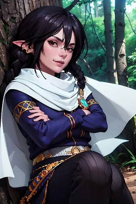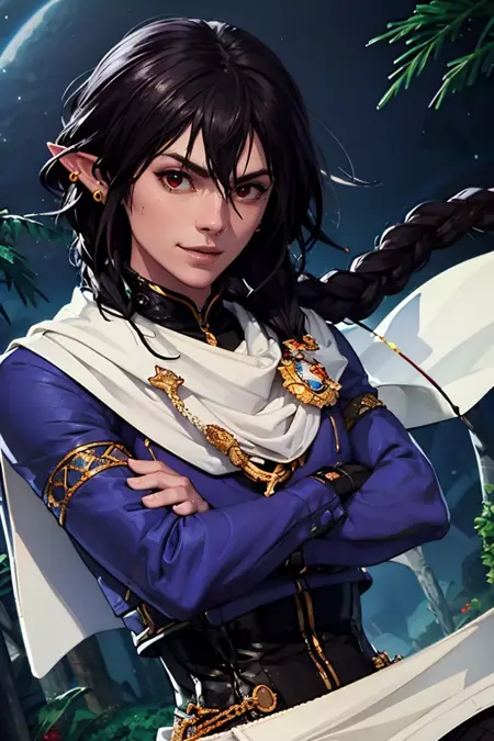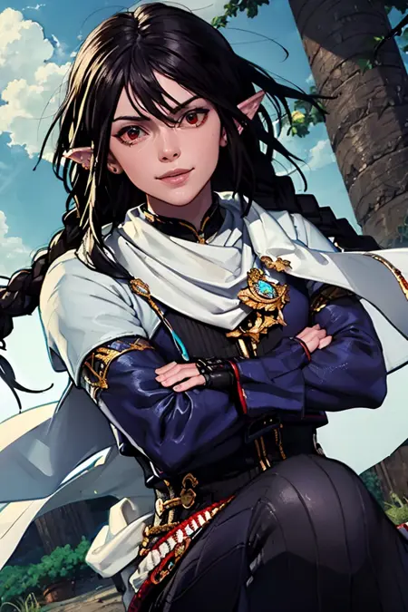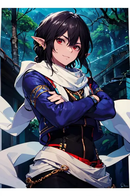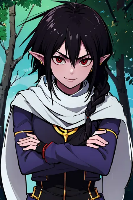 swiftmaster, pointy ears, 1boy, male focus, black hair, gloves, red eyes, fingerless gloves, braid, long hair, smile, jewelry, scarf, black gloves, earrings, looking at viewer, single