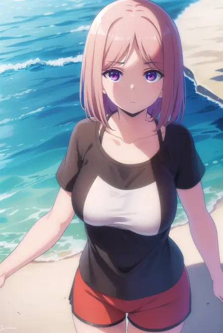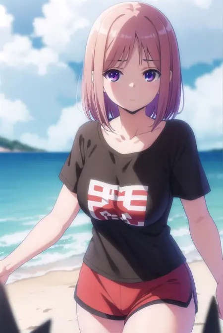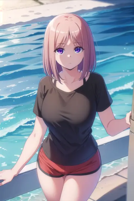 shirt, collarbone, short sleeves, shorts, black shirt, t-shirt, red shorts, dolphin shorts,