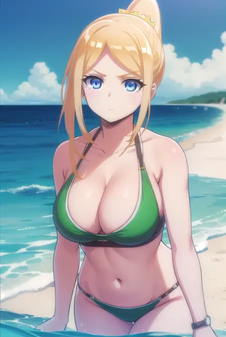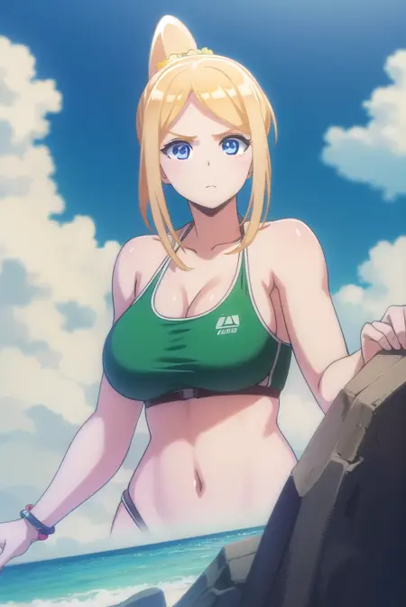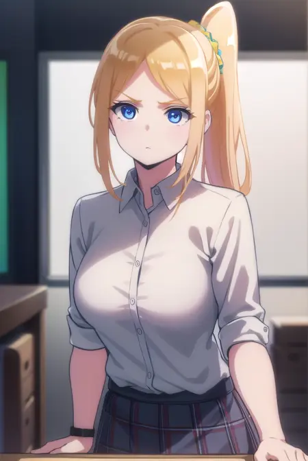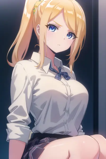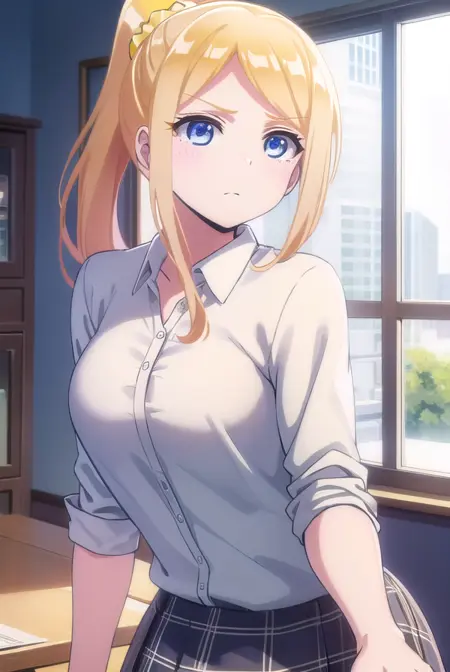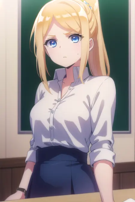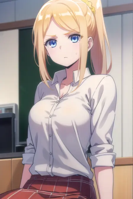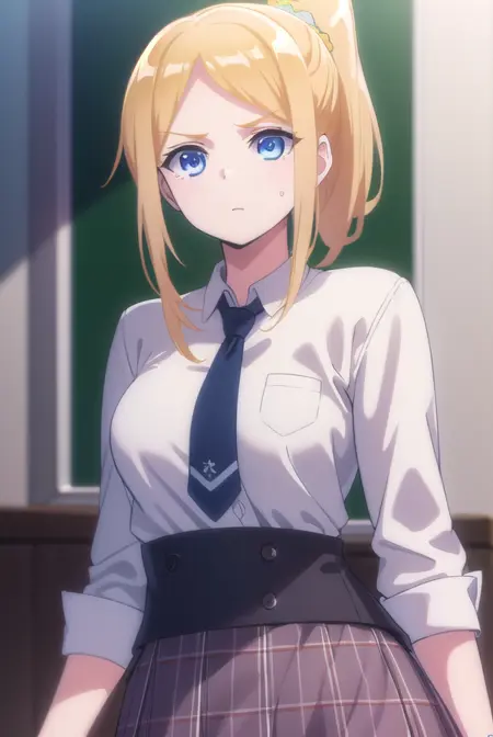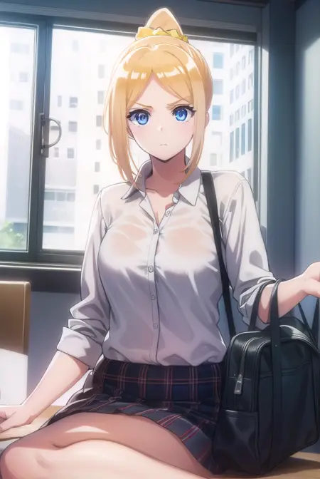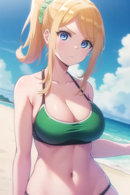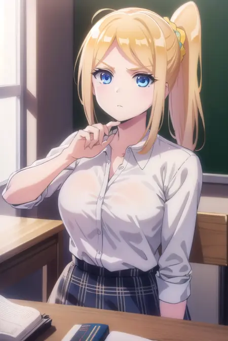 claire thomas, long hair, blue eyes, blonde hair, ponytail, scrunchie,