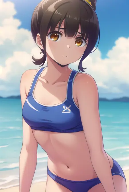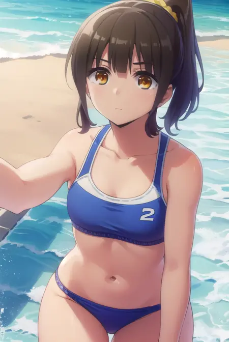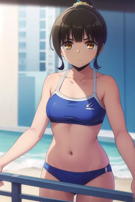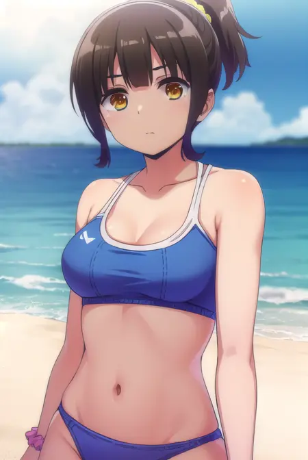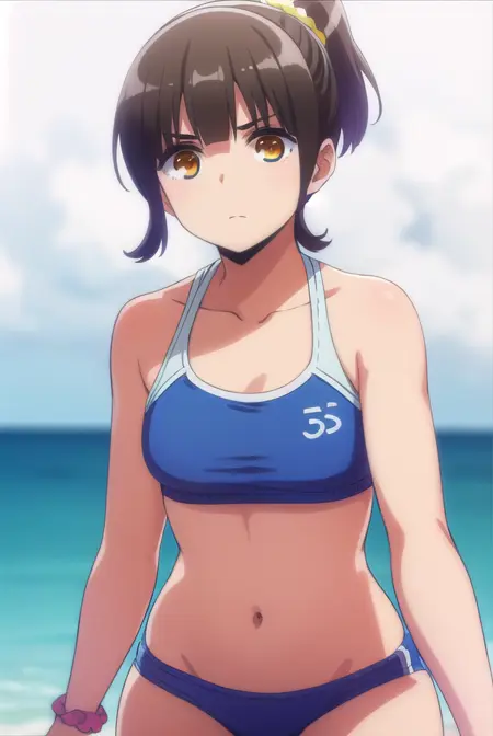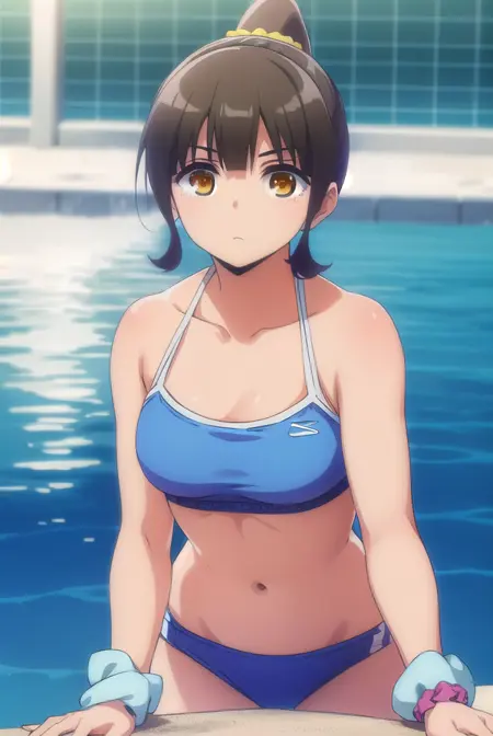 hair ornament, navel, collarbone, swimsuit, ponytail, sidelocks, bikini, scrunchie, blue bikini, hair scrunchie, yellow scrunchie, sports bikini,