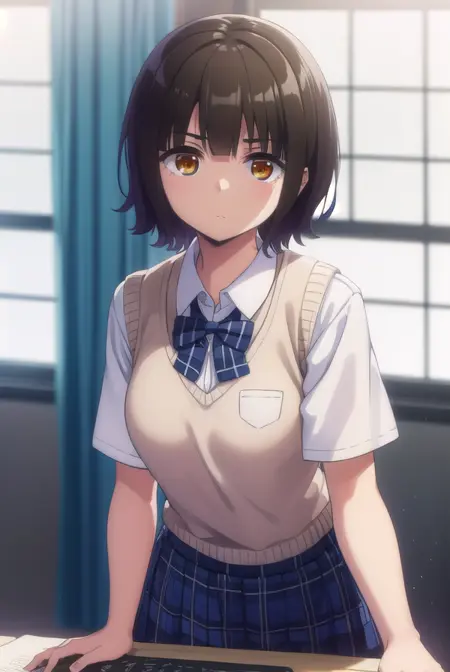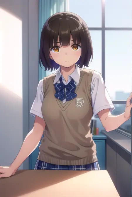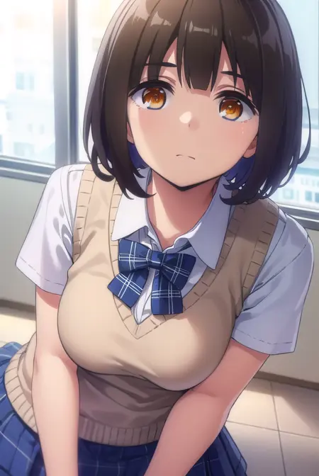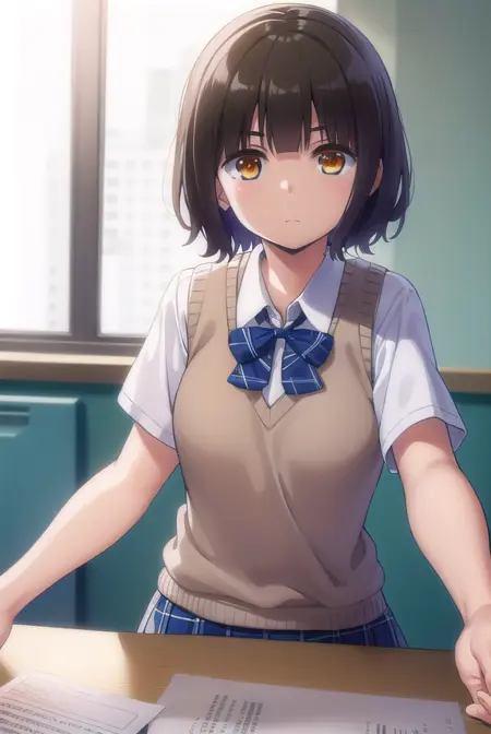 shirt, bow, school uniform, white shirt, short sleeves, bowtie, blue bow, sweater vest, plaid bow,