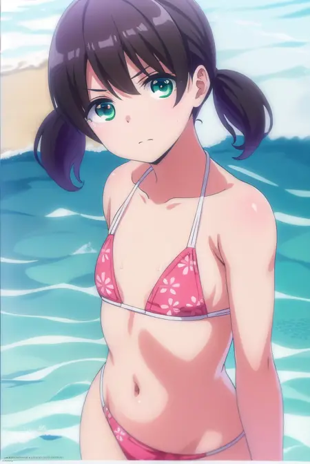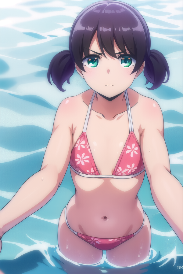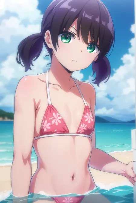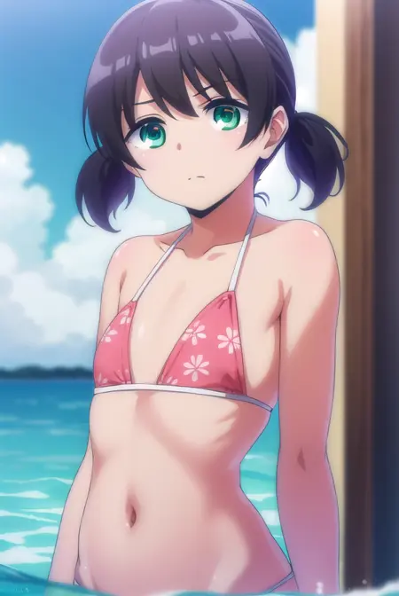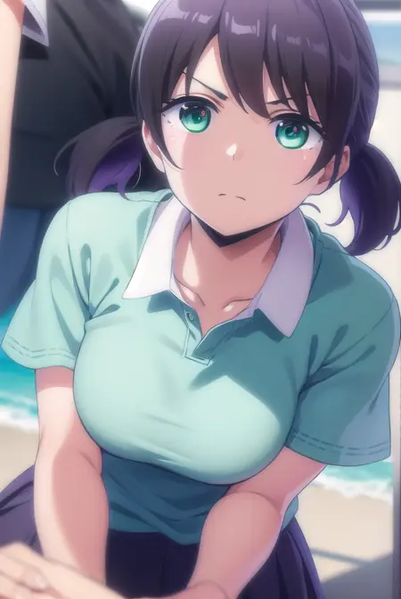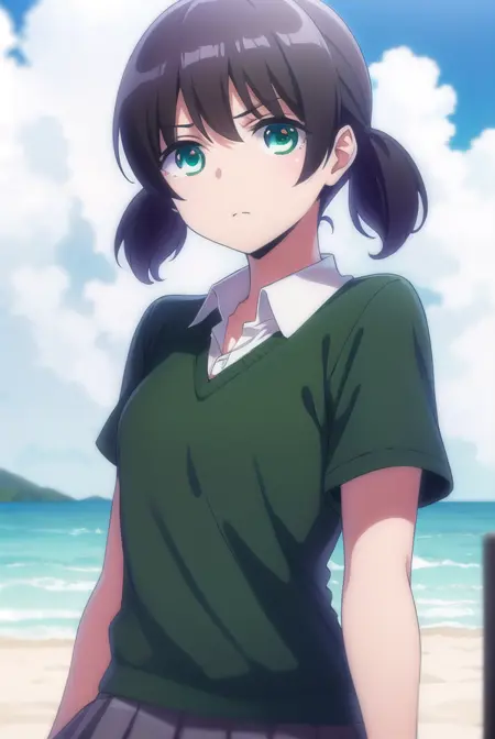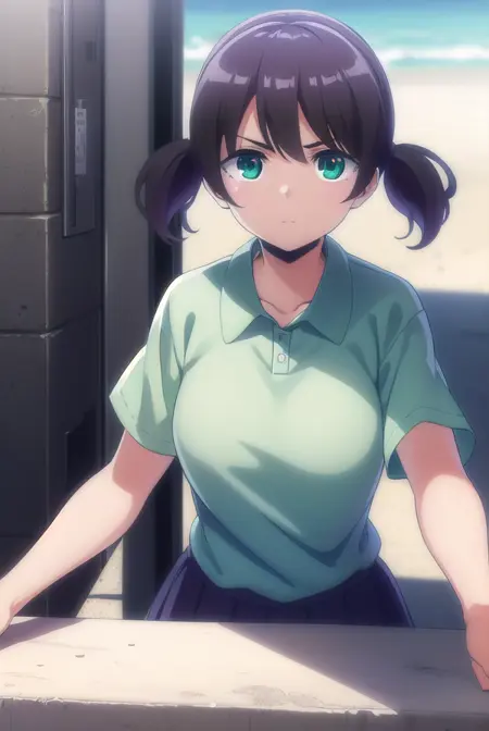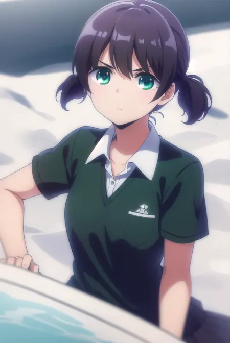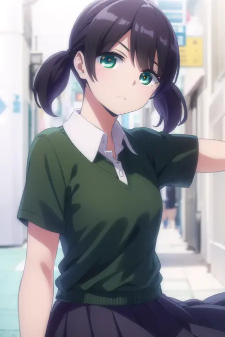 mai sunagawa, short hair, bangs, twintails, (green eyes:1.3), black hair, short twintails,