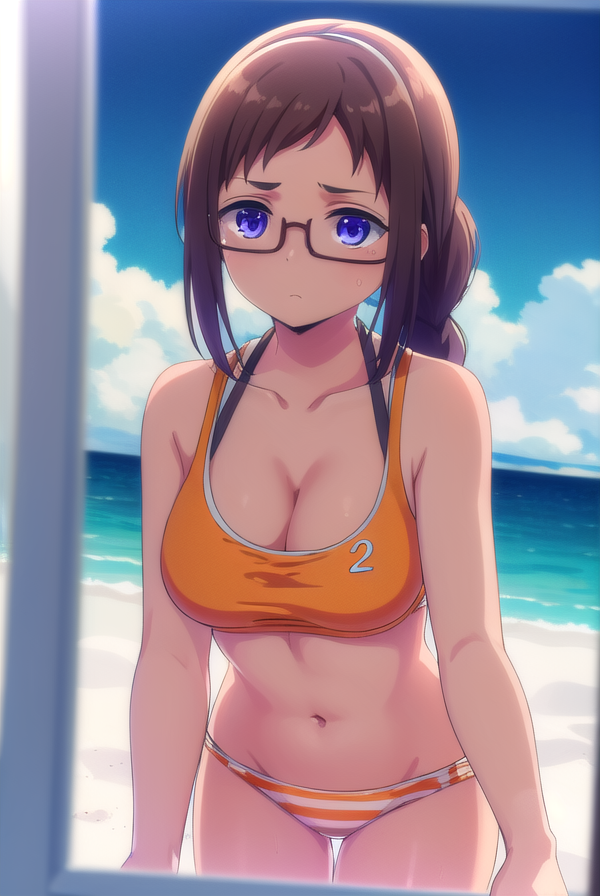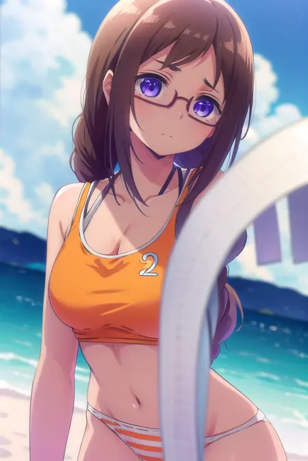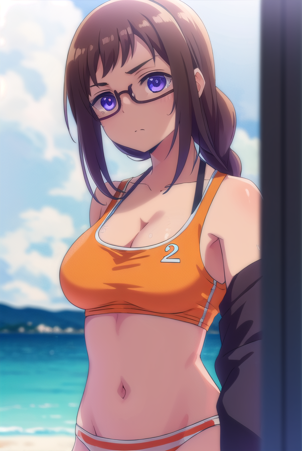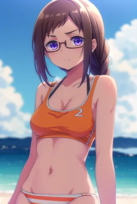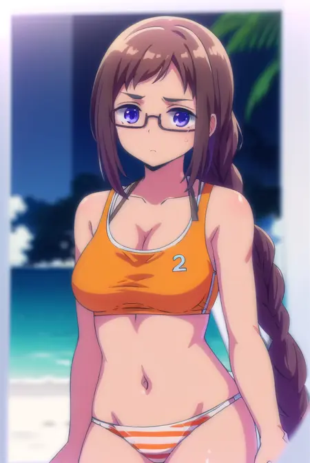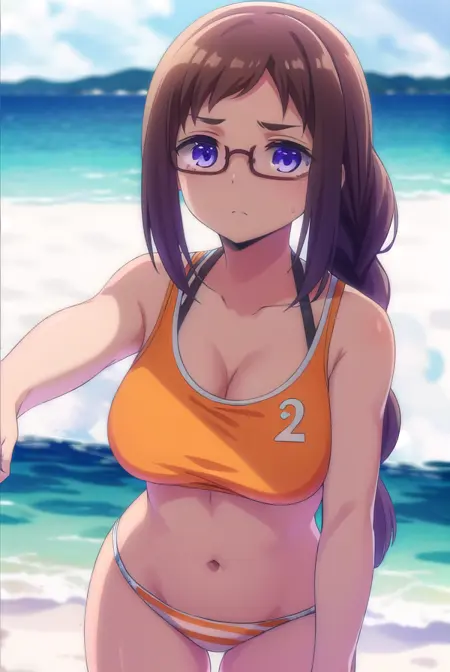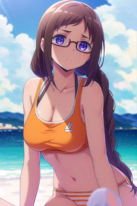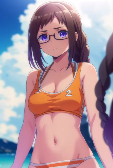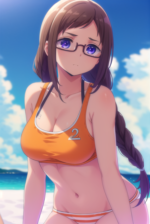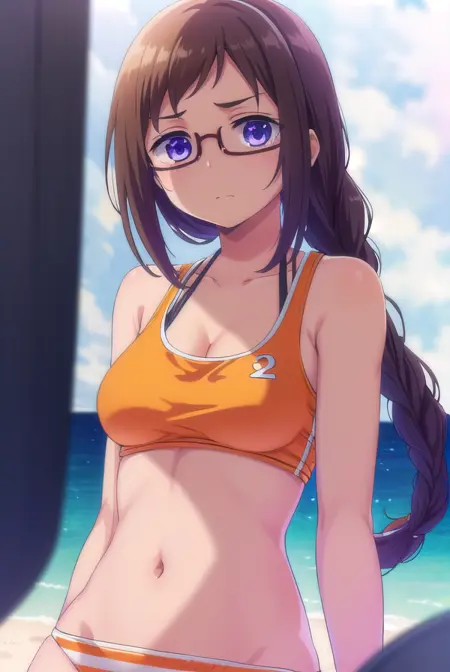 youna aragaki, long hair, brown hair, (purple eyes:1.1), braid, glasses, single braid, semi-rimless eyewear, braided ponytail,