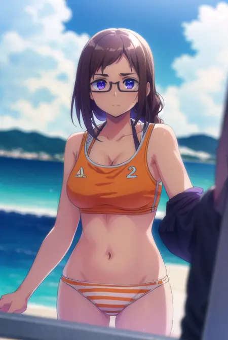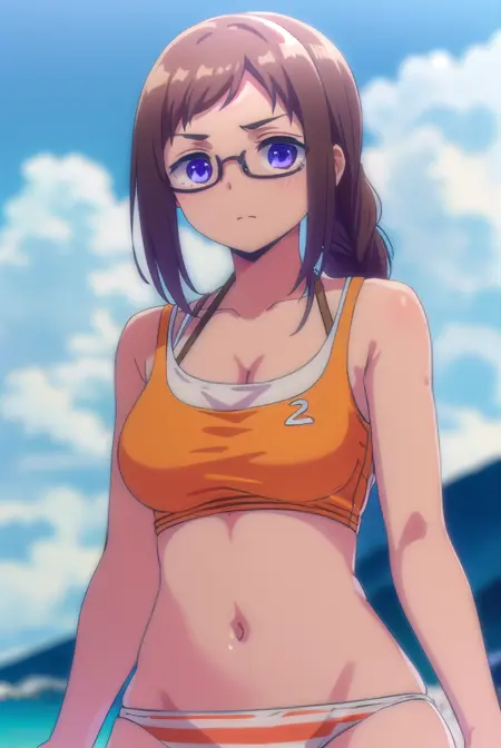 navel, swimsuit, bikini, striped, striped bikini, sports bra, orange bikini, sports bikini,