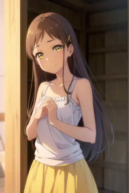 chie sayama, brown hair, (yellow eyes:1.5), hair ornament, hairclip,