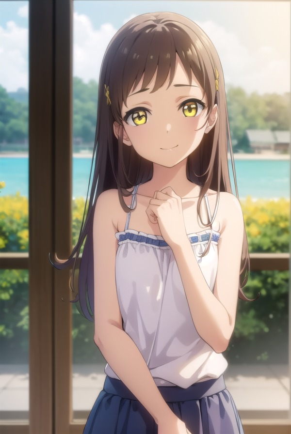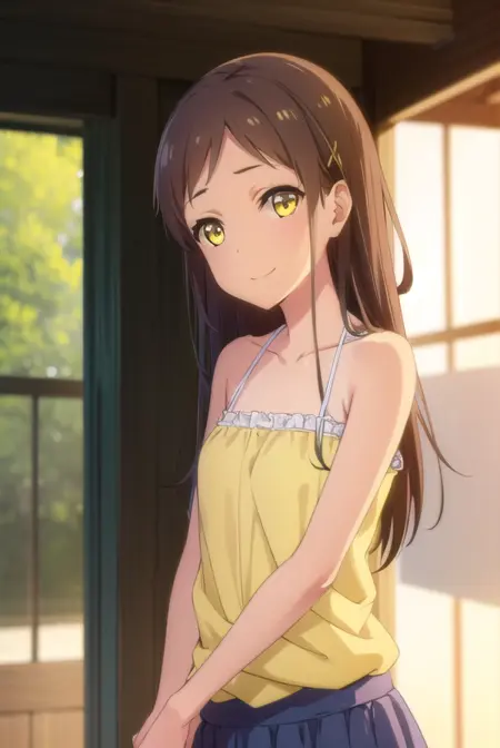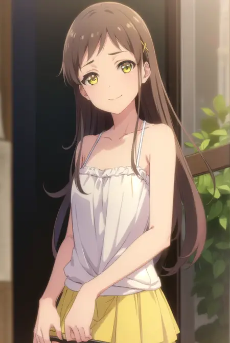 camisole, blue camisole, bare shoulders, collarbone, skirt, yellow skirt,