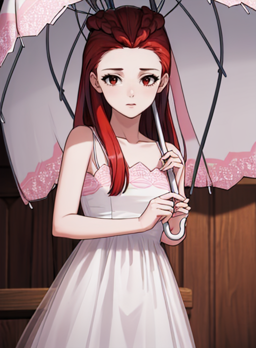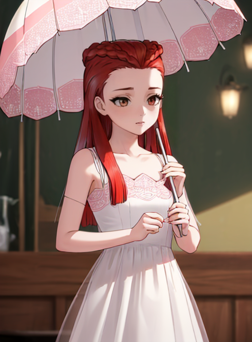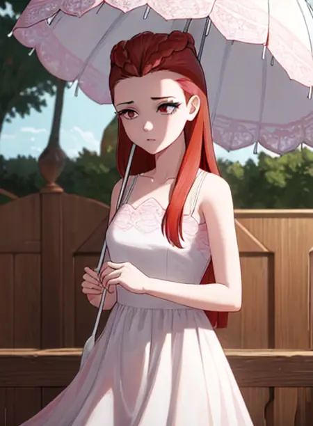dahlia hawthorne, long hair, red hair,Add: dress, umbrella