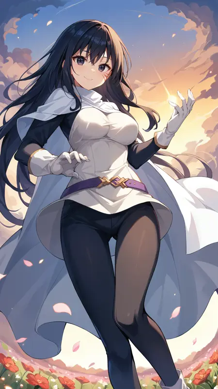 white shirt, white cape, black pants, long hair, black hair, dark blue eyes, white gloves