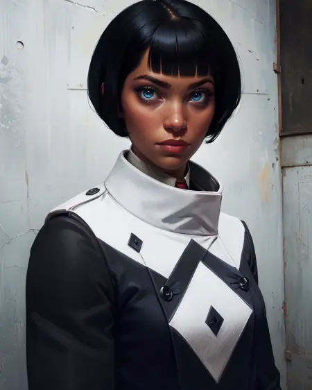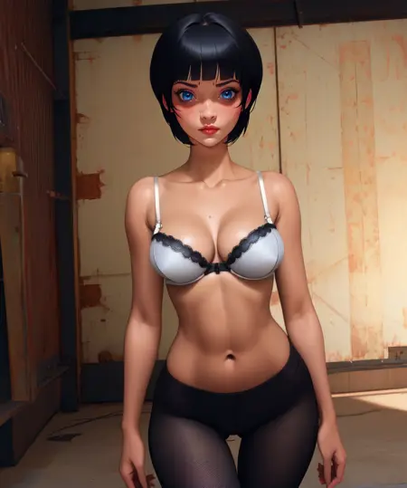 very short hair, or very short bob cut, or ,very short hair, blunt bangs,