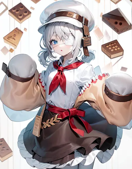 1girl, blue eyes, solo, hair over one eye, (((white pantyhose))), hat, white hair, skirt, neckerchief, white headwear, long sleeves, shoes, twintails, sleeves past wrists, shirt, brown skirt, brown footwear, bangs, black skirt