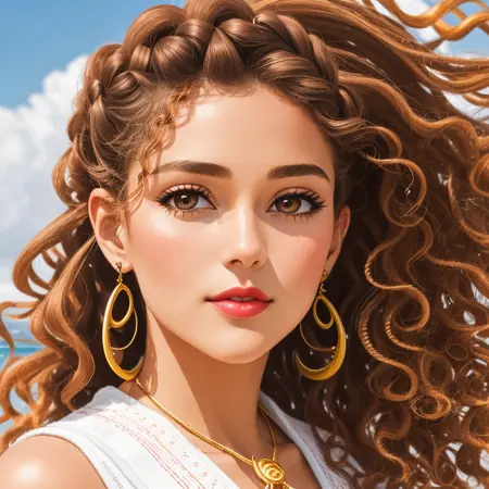 웨이크보딩, 제국 여제, 짧은 키, 단단한 몸매, 사각형 얼굴, 올리브 피부, 금발 머리카락, 회색 눈, 좁은 코, 얇은 입술, 두드러진 턱, 어깨 길이 머리카락, 얇은 머리카락, 높은 허 messy 헤어스타일, 풀 가슴, 허위 게이지 귀걸이, 테라코타 메탈릭 립스틱